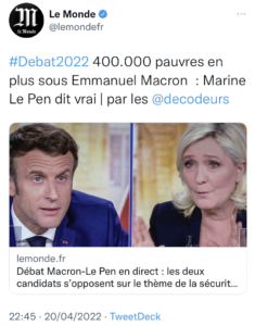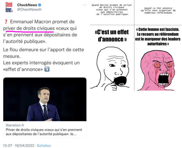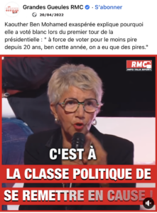 Pour ma part, et cela n’engage que moi, je ne pense pas que mes parents et moi survivront à 5 années en cas de réélection de Macron, nous serons morts et enterrés avant 2027/29. Mon père, ayant de gros ennuis de santé et qui suit un traitement expérimental, ne survivra pas à 5 ans sans droit élémentaire aux soins. Ma mère, qui a toujours été psychologiquement fragile, ne survivra pas à 5 années de pression psychologique en montagne russe. Me concernant, cumulant soucis de santé chroniques, non reconnus comme un handicap tout en l’étant au quotidien, ayant conduit à une impossibilité d’exercer mon métier, je ne survivrais pas à 5 années sans soins et sans ressources élémentaires pour faire face au coût de la vie… Et vous savez quoi, je pense que nous sommes loin d’être des cas isolés…