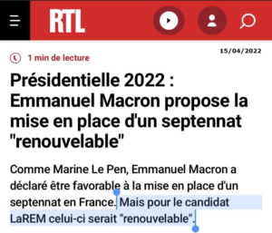Macron évoque ouvertement, sans équivoque, le fait de remettre en place un septennat renouvelable (tiens, comme en Russie), donc vous risquez de vous le coltiner à vie le monarque élu « démocratiquement ».