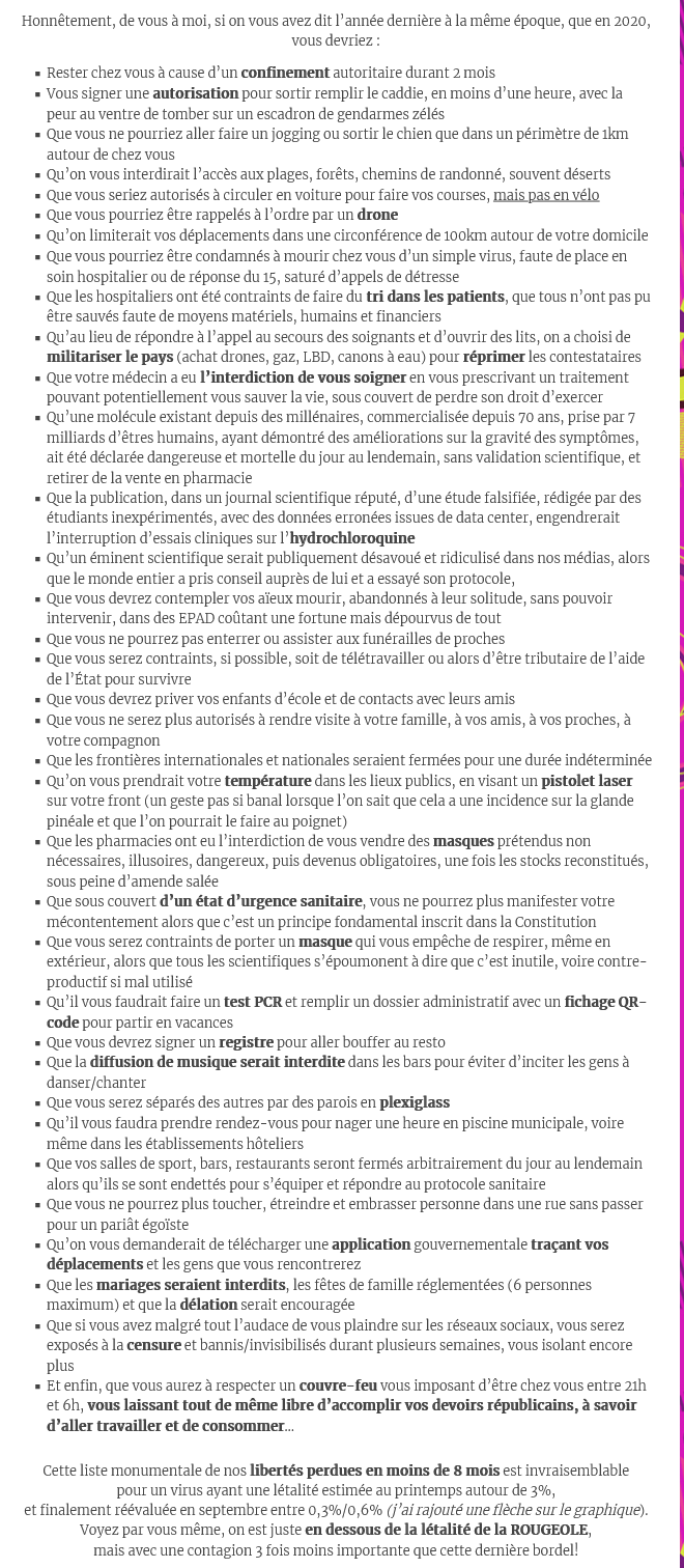 Rien qu’en automne 2020, j’avais dressé dans cet article la liste des libertés perdues à l’époque avec la crise sanitaire. Inutile de préciser que cela s’est accéléré et a empiré en 2021…