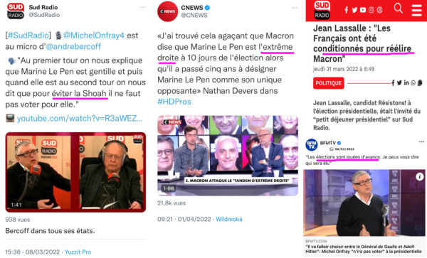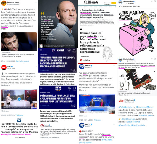 La diabolisation médiatique est l’arme politique majeure utilisée par les opposants dépourvus d’arguments. On utilise le nom de Marine pour générer de la peur, une peur viscérale que l’on nous a inculqué dès notre enfance pour l’ériger en principe, à l’école, au lycée, à la TV, dans nos médias. Le bourrage de crâne a bien fonctionné car c’est un argument récité instinctivement par le peuple qui souhaite se préserver du fascisme sans se rendre compte qu’il servira à faire réélire un « président monarque » qui sert un Système que l’on peut, lui, qualifier de fasciste dans la mesure où il se revendique transhumaniste à tendance eugéniste.