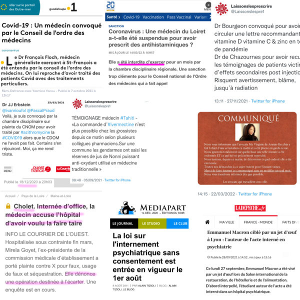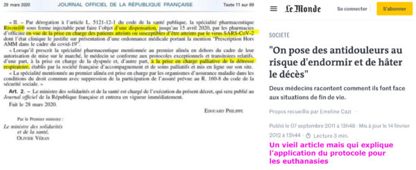 Durant la crise covid, nous avons été quasiment le seul pays à autoriser le protocole Dodo en EHPAD (Rivotril/Morphine) qui a permis d’euthanasier les patients âgés ne pouvant être accueillis en CHU (autour de 5000 morts). Dans le même temps, nous avons contribué à saboter tous les essais cliniques confiés par l’OMS sur les molécules repositionnées. Nous avons interdit à nos médecins de soigner et de prescrire. Tout opposant a été soit interdit d’exercer ou convoqué pour expertise psychologique (certains ont été internés contre leur gré, une nouvelle loi autorise les préfets à le faire sans décision de justice). Beaucoup de malades auraient pu être sauvés sans l’adoption de ces mesures, mais il fallait des morts pour générer de la peur et faire accepter la suite de leur agenda…
