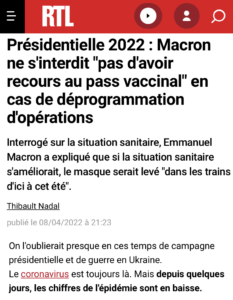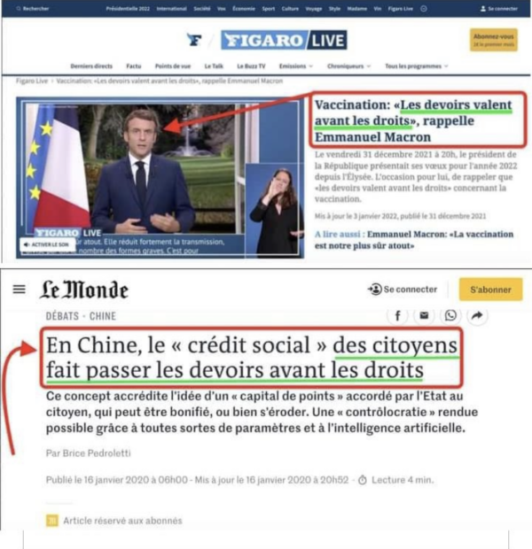 Inutile de préciser que, dès sa réélection, le pass, « un outil intelligent » comme il le qualifie lui-même sera remis en place, la coercition étant sa marque d’avilissement suprême, conditionnant ainsi les droits à des devoirs (dont celui d’être obéissant). Cette vision anti-démocratique remet en cause notre Constitution et notre appartenance à un pays de Droits. « Les devoirs avant les droits » c’est le slogan utilisé en République Populaire de Chine pour déterminer leur politique publique de crédit social. Personne, je pense, n’envisage de vivre un jour le cauchemar chinois en résidant dans le pays des droits de l’Homme.