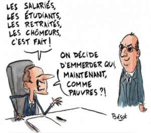 J’entends des gens se lamenter que le « fascisme » monte au pouvoir. Je les entends se plaindre aujourd’hui de devoir choisir entre la peste et le choléra, mais qu’avez-vous fait pour y remédier ces dernières années? J’entends des gens dire que si Marine venait à être élue, alors nous serions confrontés à deux classes de personnes n’ayant pas les mêmes droits en France, que c’est choquant, révoltant et que c’est anti-républicain ! LOL ! La réalité c’est que cela fait bien longtemps que ces stratifications existent déjà en France. Si elles ne sont pas fondées sur une question relative à la couleur de peau (bien que le racisme soit très ancré), elles sont intrinsèquement liées aux ressources économiques, les riches ont des droits infinis que les pauvres n’auront jamais.
