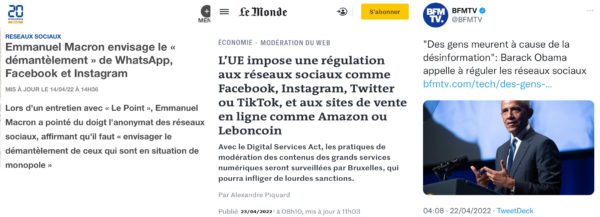 Avec la loi Avia (retoquée 2 fois par le conseil constitutionnel), la fin de la liberté d’expression est actée. Elle a été votée par l’UE. Macron a déjà prévenu que dès sa réélection, il ferait brider les réseaux sociaux qui représentent l’ultime contrepouvoir à la propagande médiatique systémique.