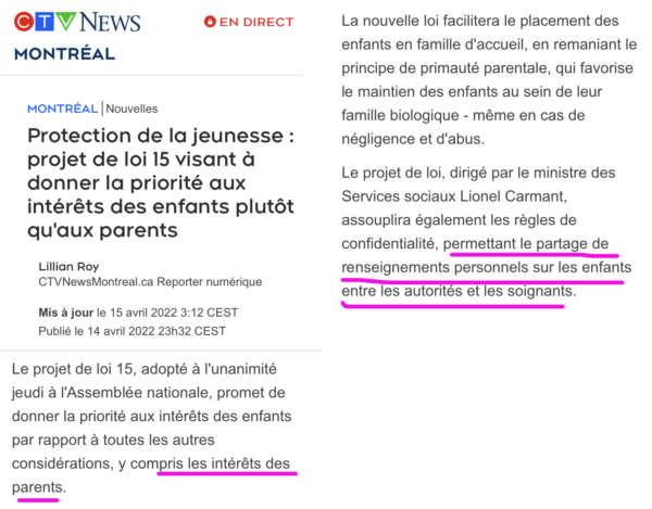 Face à la contestation grandissante au Canada des parents ne souhaitant pas que leurs enfants servent de cobayes, la justice a mis en place une loi pour préserver l’intérêt de l’enfant en vous destituant de votre autorité parentale si vous vous montrez réfractaires aux consignes instituées. Trudeau et Macron servant les mêmes intérêts, inutile de vous dire que cela vous pend au nez aussi.