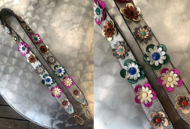 Une anse de sac italienne, en cuir, avec des fleurs multicolores (bien kitsch) 3€