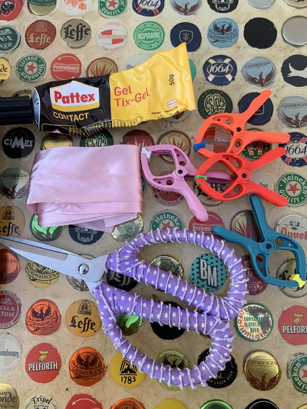 un ciseau à couture, de la colle néoprène et du ruban épais de la