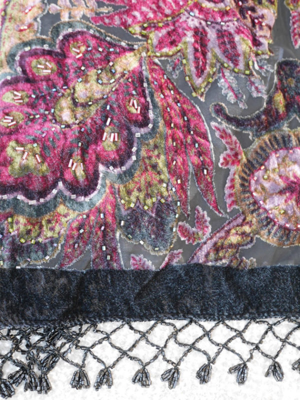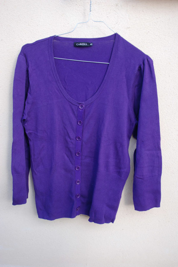 Et enfin, pour 12,75€, j’ai acheté sur Vinted : un cardigan violet en soie Caroll, une écharpe en laine (Galeries Lafayette) + une en velours dévoré brodée de perles (Scottage)