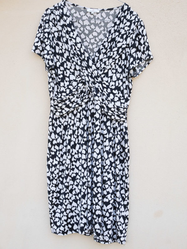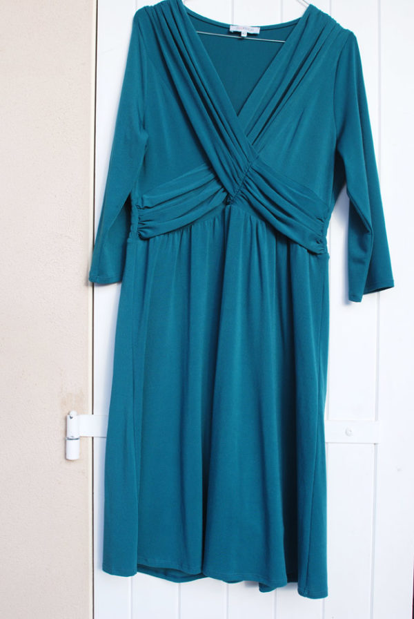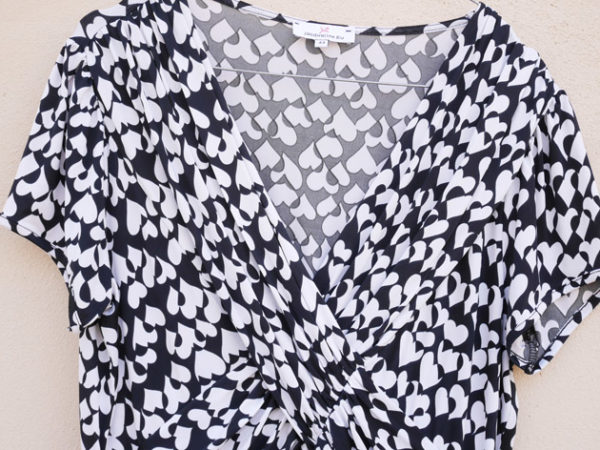 J’en ai trouvé 3 sur vinted. Une verte émeraude avec un beau drapé sur le décolleté (16€/ Scottage), une N&B à cœurs (13€/ Jacqueline Riu) et une mauve/verte assez transparente que j’utiliserais donc en blouse (8€/ Jacqueline Riu)