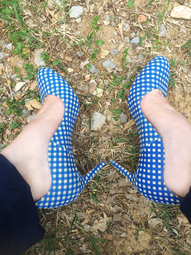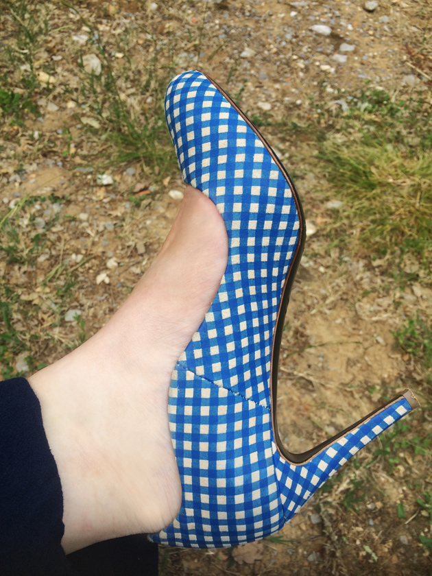 mon cabas Sézane et mes escarpins vichy fétiches Apologie Paris que j’avais dénichés à plus de 90% de réduction sur Ebay.