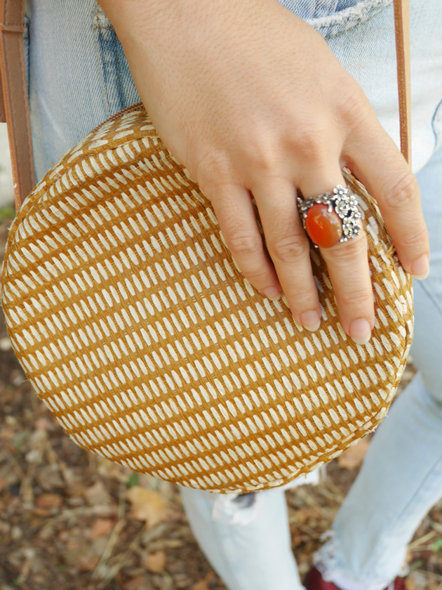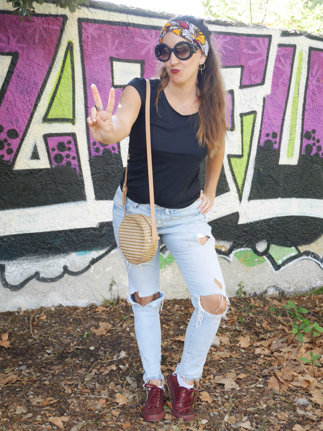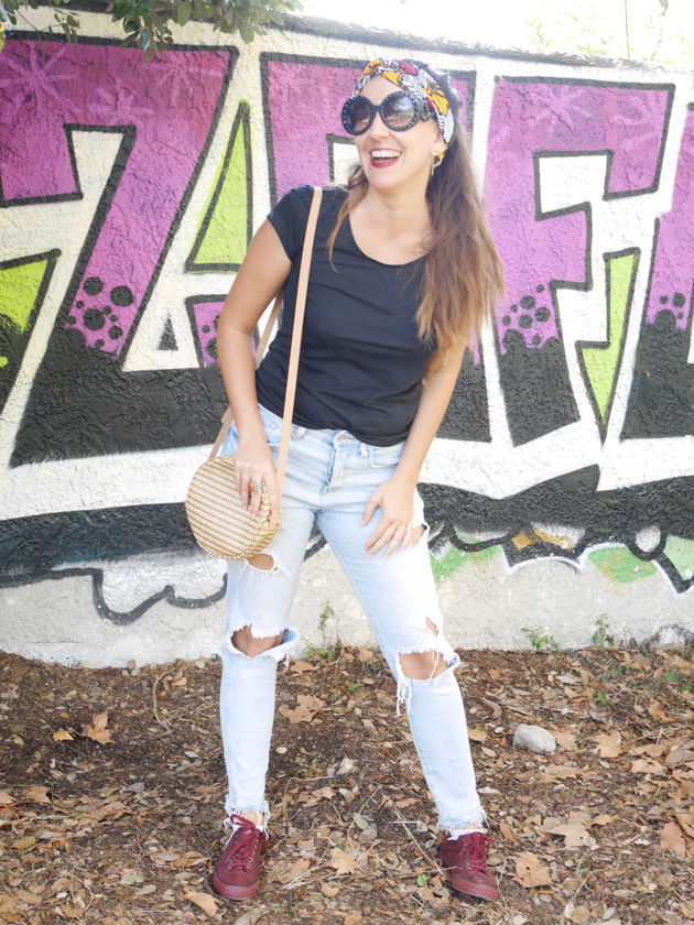 Une petite paire de tennis irisées bordeaux, un sac en paille Sessun et le tour est joué.