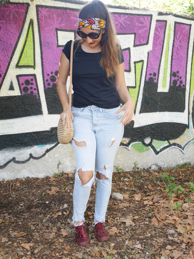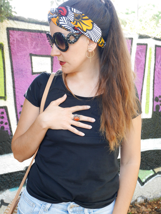 Elle a donc enfilé son jean fétiche, un tshirt basique noir histoire de mettre en valeur son foulard wax déniché à la foire.