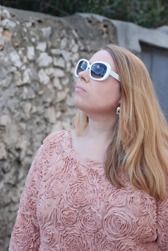 Je l’ai assortie à mon pull à fleurs 3D American Apparel que j’aime d’amour depuis mon premier coup d’oeil. En fait, ce jour là, j’étais en train de boire l’apéro dans mon bar fétiche quand une nana est entrée avec ce pull. J’aurais pu lui sauter dessus, la déshabiller et partir en courant avec mon trésor, mais bon je suis une fille civilisée, alors je me suis contentée de lui demander la marque pour me jeter sur le web en rentrant chez moi (j’ai jamais bu ma bière aussi vite lol). Et là le drame, j’ai vu son prix, ça m’a déprimé. J’ai mis donc 3 ans à fouiller les sites de revente pour le trouver. Ça fait maintenant pile 1 an qu’il partage mon dressing et je crois qu’il demeure toujours mon petit préféré.
