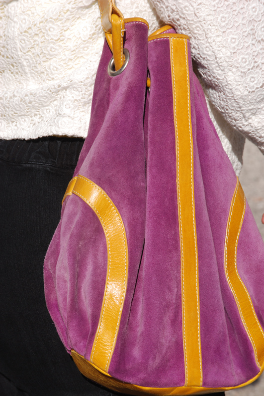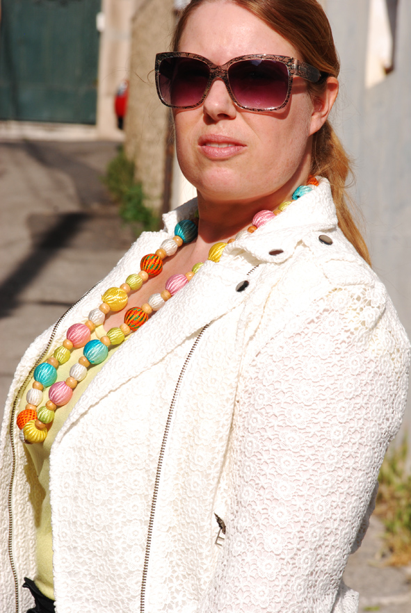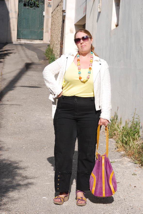 Ces espadrilles ont au moins 4 ans. Ce sont des pantoufles de ville de la marque Tamaris (que je porte depuis plus de 10 ans). Quant à mon sac, je l’ai acheté il y a 2 ans à la foire de Marseille chez le créateur italien Marrant qui a toujours un vide stock de folie. Et puis j’ai vu dans un magazine de MODE que le retour du sac seau serait la grande tendance de l’été!!!! Je serais donc à la dernière MODE, malgré moi, et ça m’a bien fait rire. En plus je suis en jaune, la couleur tendance du printemps! Avec autant de couleurs, j’ai choisi la sobriété du noir et blanc avec un jean Jean Marc Philippe ramené de Paris et ma veste fétiche en dentelle Lynn Adler, un peu mon uniforme d’avant les grosses chaleurs, pour aller bosser mais toujours avec des accessoires colorés.