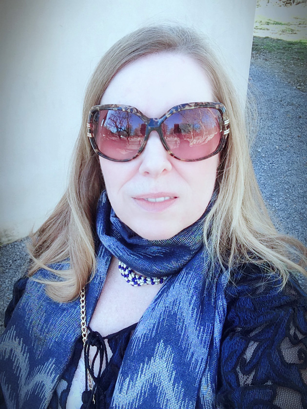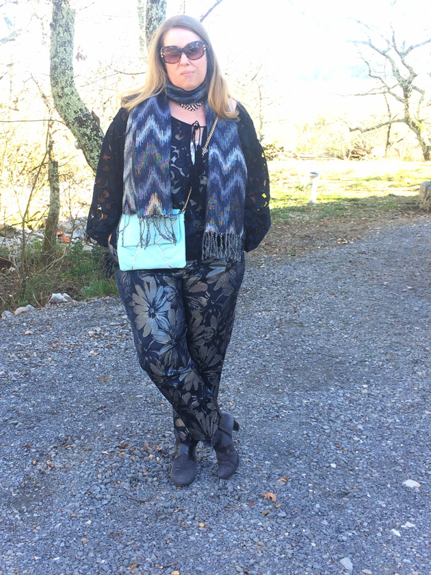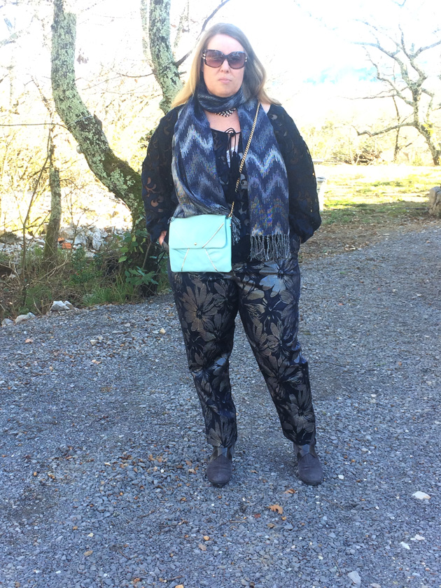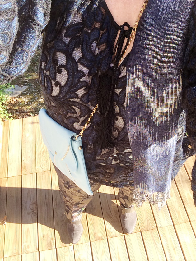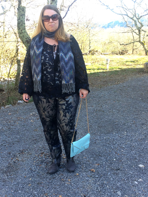 turban en velours vintage sur lequel j’ai épinglé une broche, mon top ajouré