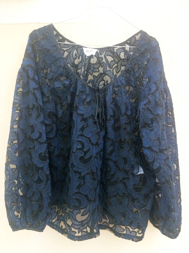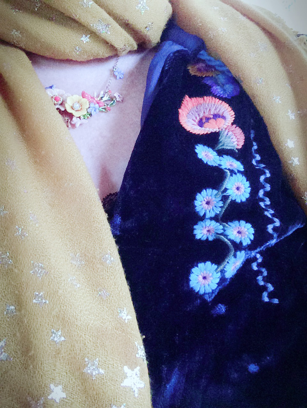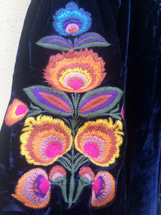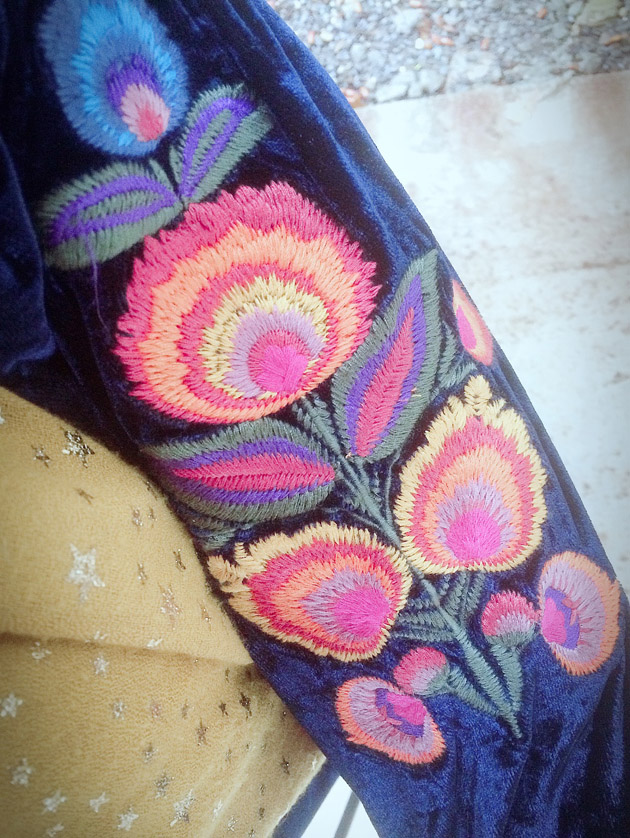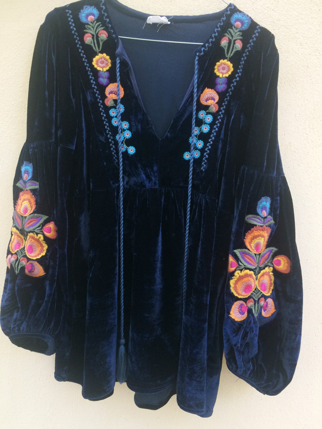 Je voulais tellement vous montrer cette blouse en velours brodé marine, reçue cet été,