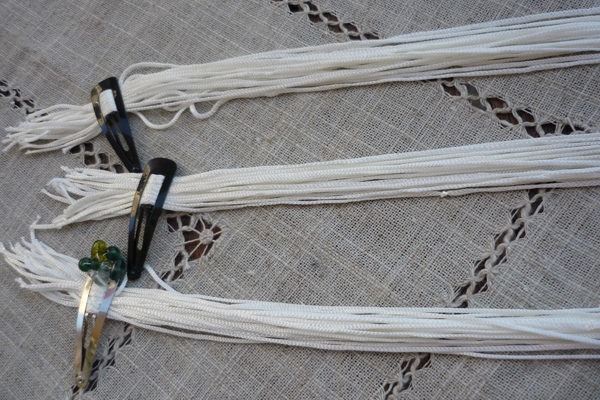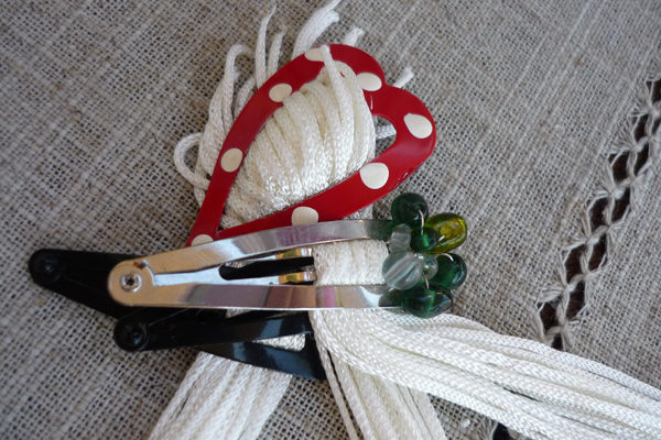 J’ai sélectionné 3 x 20 fils. Je les maintiens avec des barrettes à cheveux.
