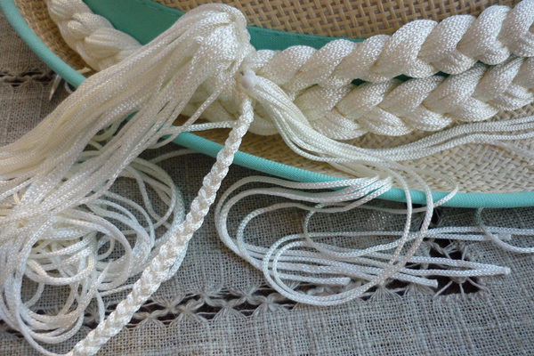 On positionne la tresse sur le chapeau en la fixant avec des épingles (j’ai mis 2 rangs sur le devant et un à l’arrière).