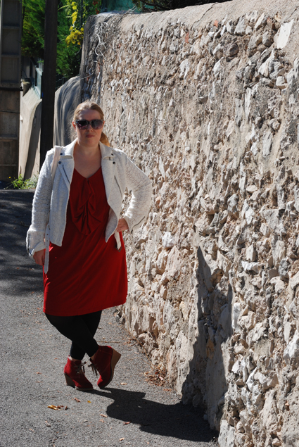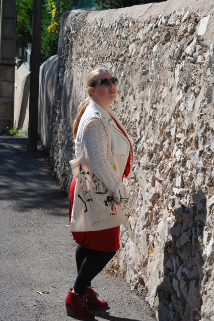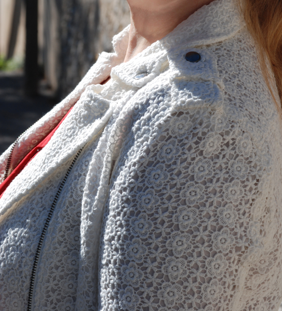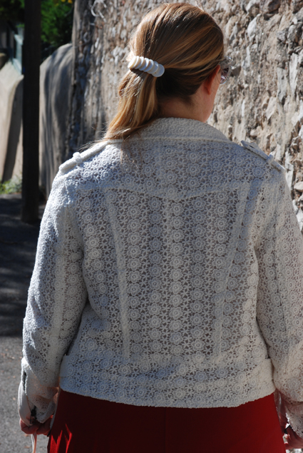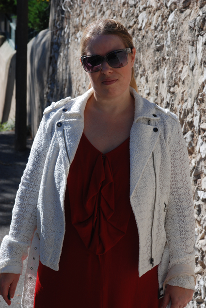 Vous êtes plusieurs à avoir montrés de l’impatience à voir mon perfecto en dentelle de la marque Lynn Adler dans un look, voilà, c’est chose faite. Les photos ne sont pas extraordinaires, désolée, j’étais hyper pressée ce jour là et il faisait tellement chaud (bon ça date un peu, hein) que j’ai cru mourir avec ma veste (mais bon faut souffrir pour être belle, non?). Et puis je me suis installée dans une ruelle en cul de sac où les véhicules ont défilé non stop, m’obligeant à pousser tout mon matos et à refaire tous les réglages !!!!! Y a des jours comme ça…