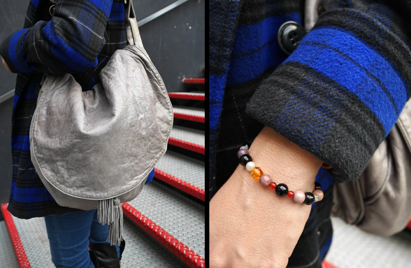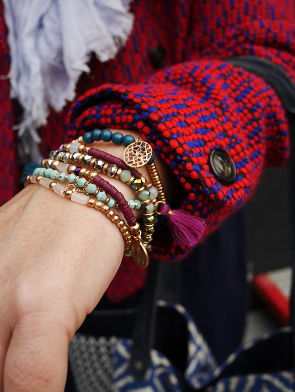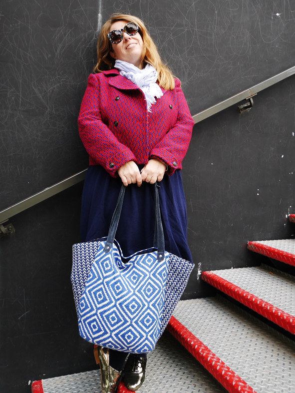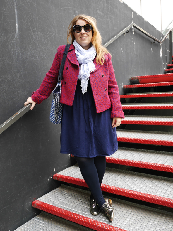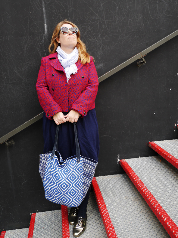 Cette veste, je l’ai achetée l’hiver dernier lors d’une VP Armand Ventilo sur Showroomprivé mais j’ai zappé de vous la montrer, oups… J’ai craqué pour sa couleur atypique avec son mélange rouge/ bleu klein. Comme elle est très forte, je suis restée sobre niveau coloris avec un camaïeu de bleus. Une vieille robe Monoprix (un modèle qui ressort régulièrement en magasin), une petite écharpe pour le froid et mon cabas ethnique Bouchara.