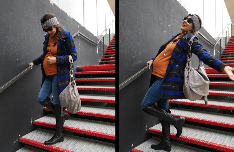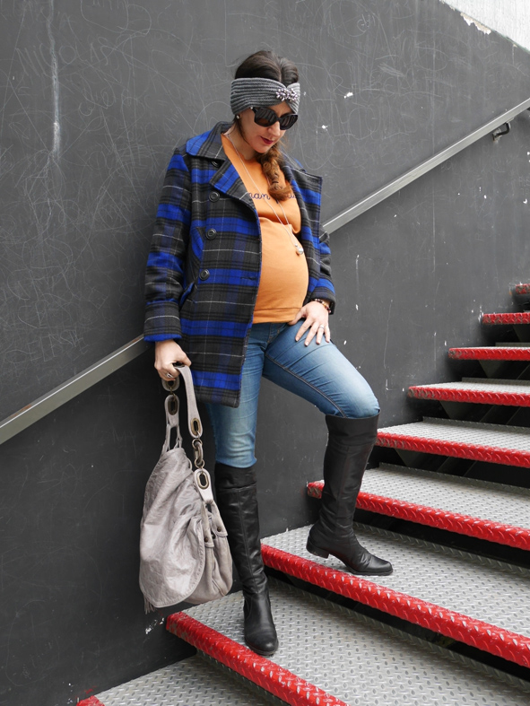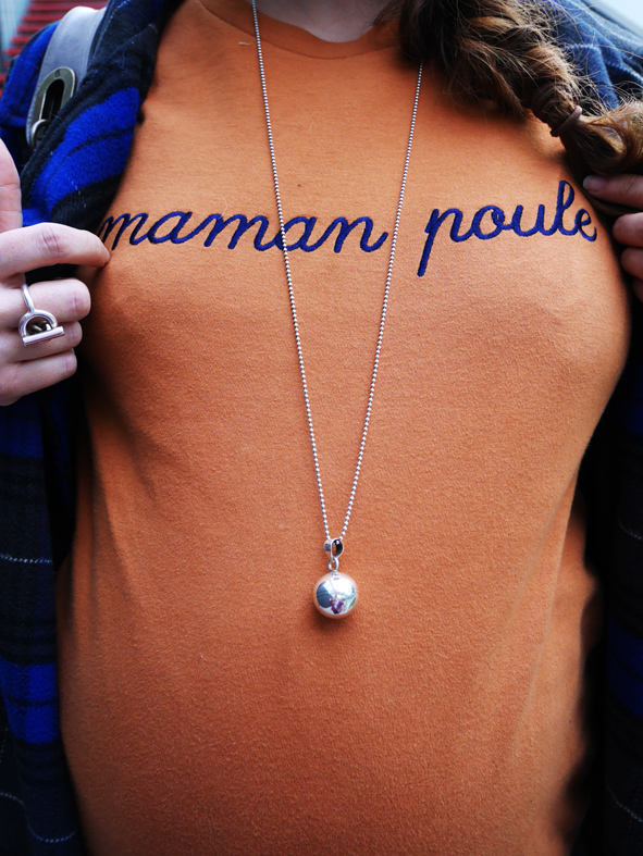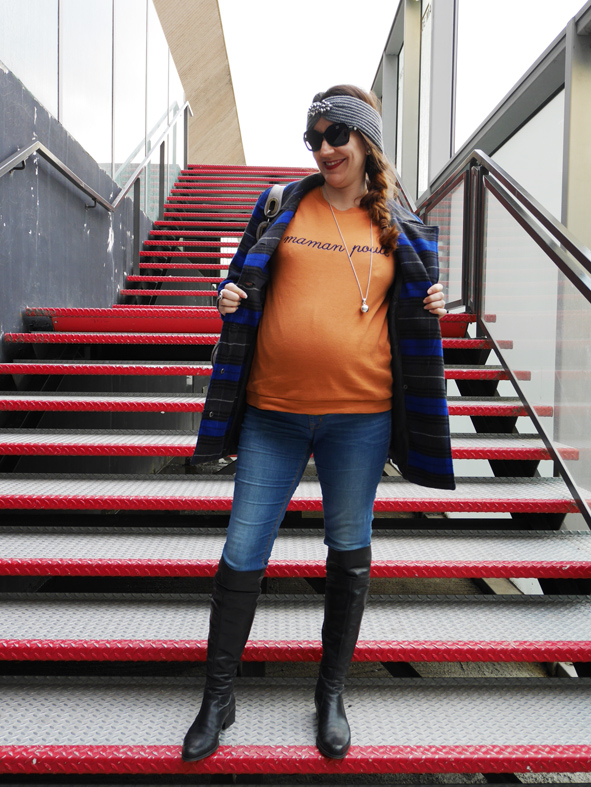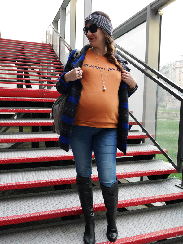 Regardez-moi cette jolie maman poule, n’est-elle pas rayonnante? Justine avait acheté ce pull lors de la dernière vente Aides. Elle a travaillé son look en orange/bleu avec des accessoires gris.