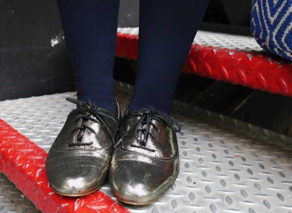 A mes pieds, des petites derbies Sylvian Heach en cuir doré que j’avais trouvés en soldes en destock pour 15€!!! Il faut dire que ma blogocopine Valérie lance des défis looks sur Instagram et cette semaine le thème était : les chaussures dorées ou argentées #teamcolorfullorargent