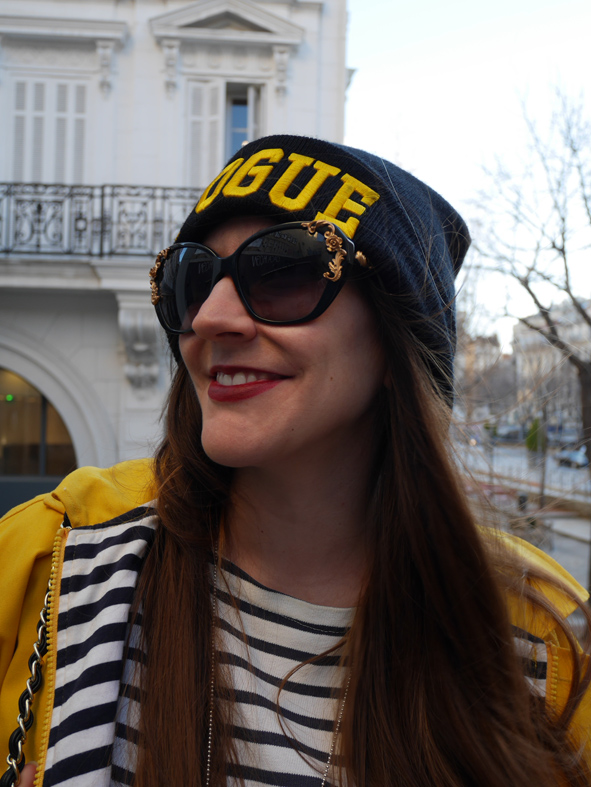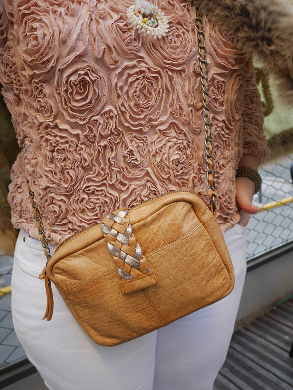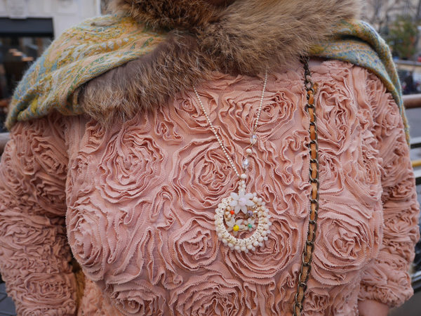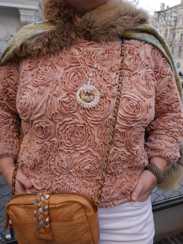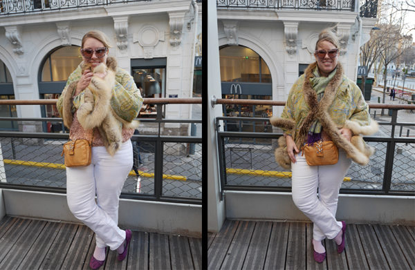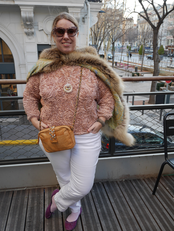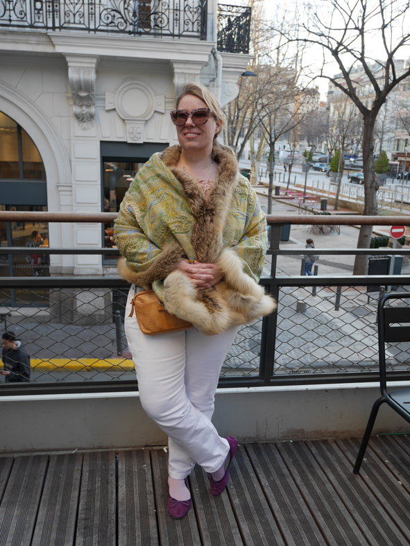Côté tenue : j’ai ressorti mon pull fétiche 3D flower American Apparel, avec un petit jean blanc et un sac en cuir camel. Aux pieds, mes vieilles ballerines Monoprix (pas très solides, je ne les recommande pas, heureusement que je les ai eues à -50%). Et pour me réchauffer, j’ai ressorti mon pashmina indien en laine et fourrure. Je le porte en cape. C’est très pratique à mettre et enlever lorsque l’on fait les boutiques et qu’on passe d’un lieu surchauffé à un extérieur venteux. Il est très chaud et donne du chic à n’importe quelle tenue.