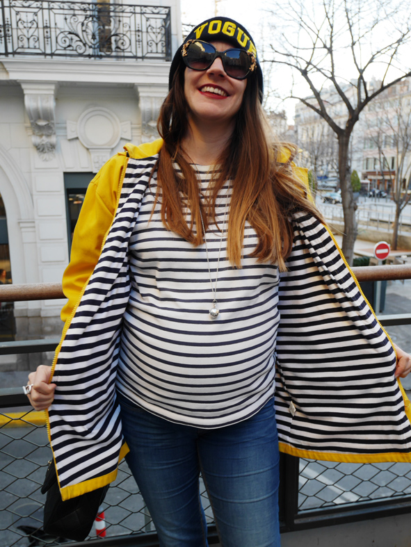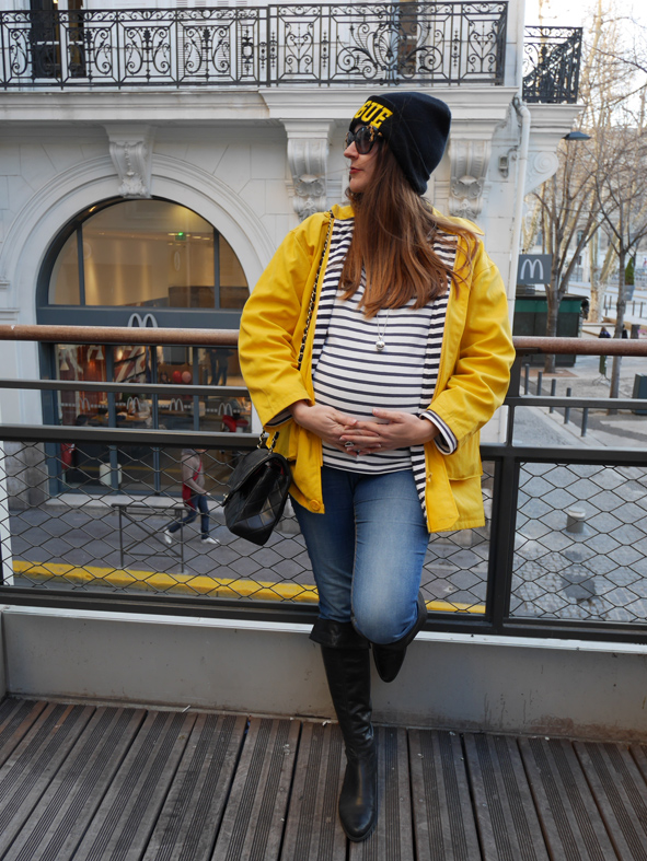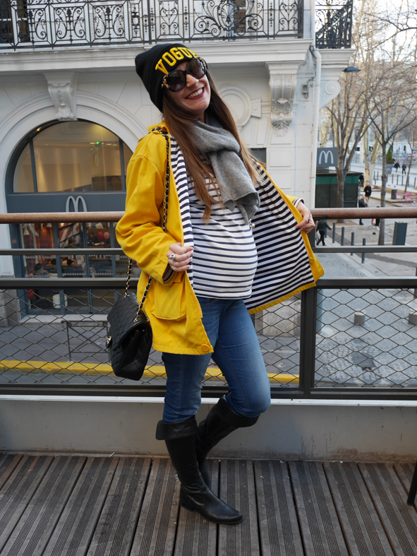 Justine a bien rentabilisé son jean de grossesse entre le 4ème et le 8ème mois! Elle a ressorti sa petite marinière qui est assortie à l’intérieur de sa veste style ciré breton qu’elle a dénichée pour 6€ lors de sa dernière tournée chez Emmaüs.