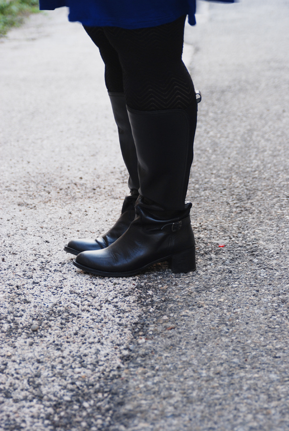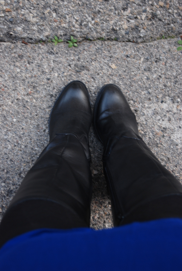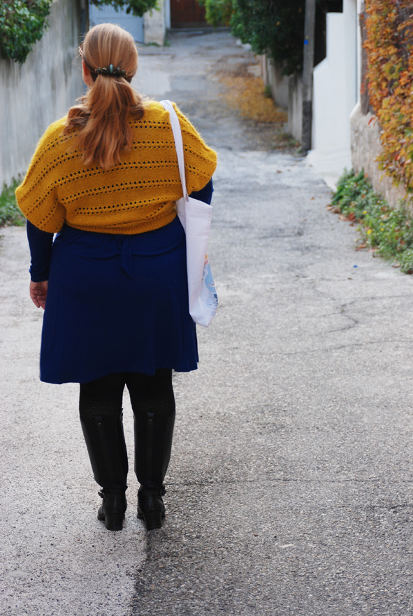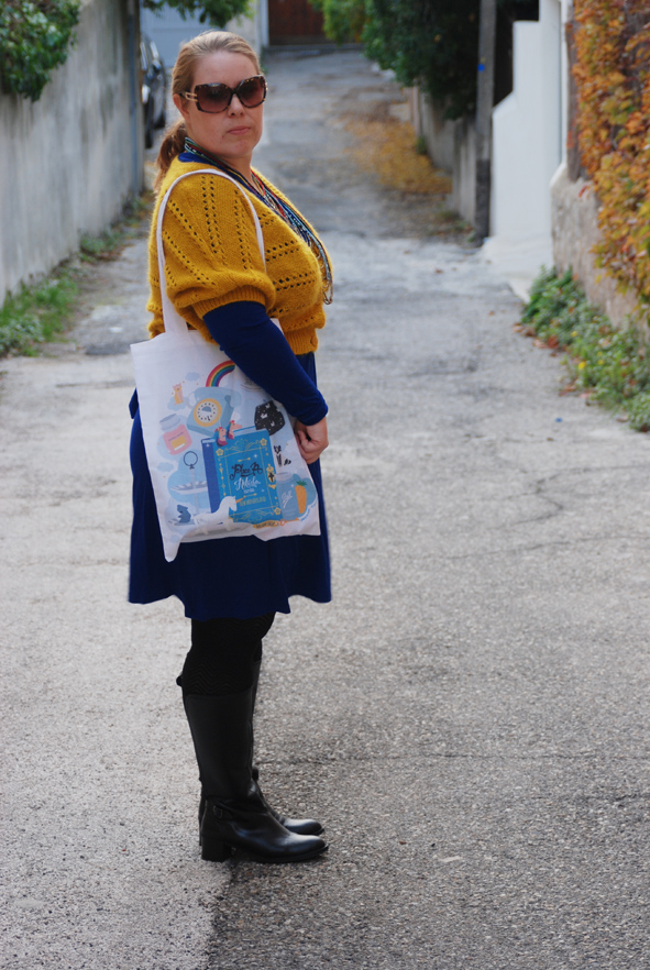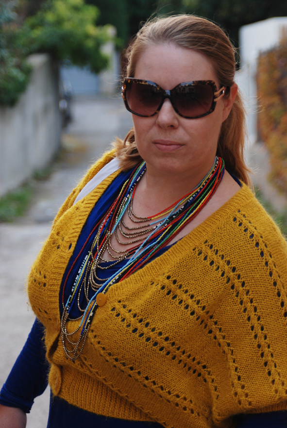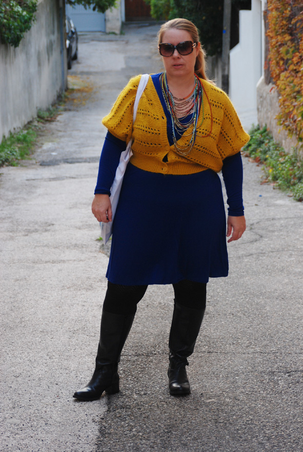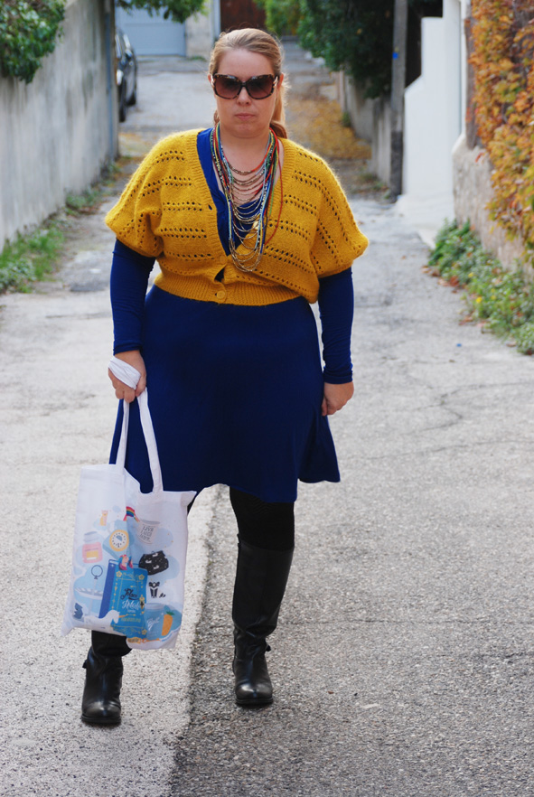 Cette petite robe vient de La Redoute. Je l’ai achetée bien soldée à -60% et j’avoue que je ne l’aurais pas gardée si elle avait été plein pot. La matière est trop légère, je vais devoir mettre un fond de jupe pour la porter en hiver, elle est plus courte que sur la photo et beaucoup trop décolletée, il m’a fallu faire un peu de couture pour ne pas finir le poitrail à l’air en 2 mouvements. Dommage, je l’avais achetée pour la mettre au boulot mais cela ne va pas être possible ou alors en tunique. Par contre j’adore sa couleur. J’ai rajouté mon gilet H&M moutarde et mon collier H&M aussi que j’avais tant cherché au printemps dernier. Je suis demeurée sobre en bas avec des bottes cavalières noires en cuir.