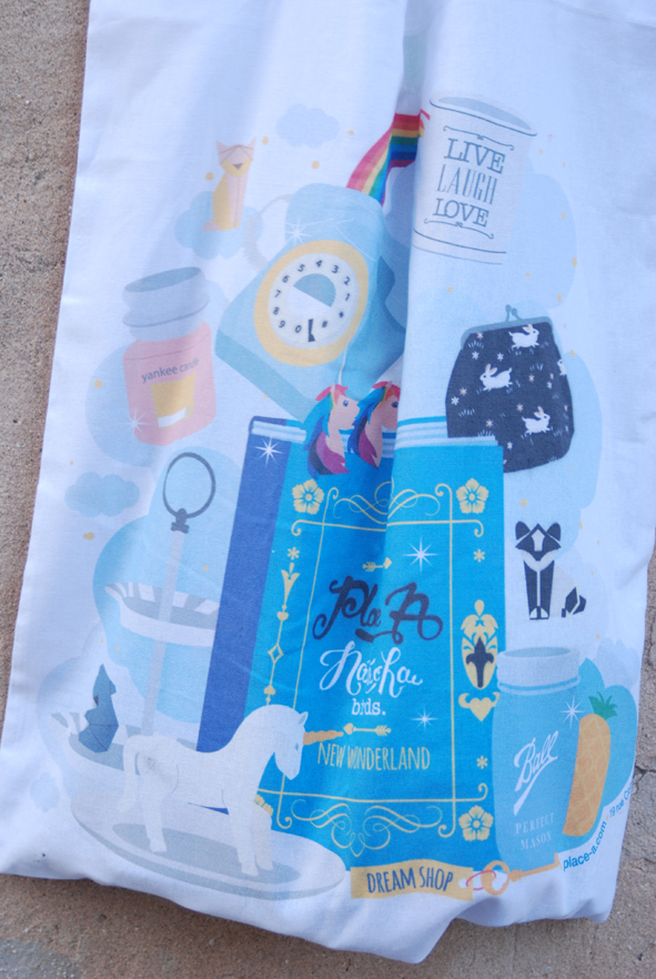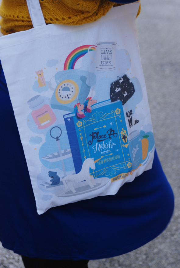 Petite nouveauté aussi, mon tote bag dessiné par la blogueuse Natacha Birds pour l’enseigne parisienne Place A. Le dessin est très girly, juste dommage que la matière utilisée soit un peu fine, j’ai peur qu’il ne survive pas à trop de charge, je vais devoir faire attention…