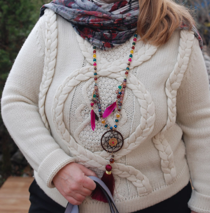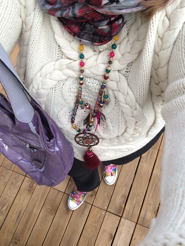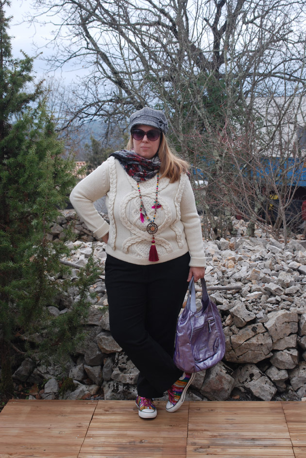 Toujours en mode recyclage de mes fringues, pas de nouveautés aujourd’hui. Après un petit coup de mistral, j’ai ressorti mon gros pull Eleven Paris, bien chaud et très joli avec son tressage. Mon look de base étant super simple à mon goût, j’ai égayé tout ça avec mon gros collier H&M et mes sandales très jungle Pare Gabia.