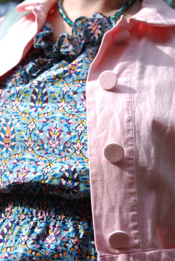 Cette robe à motifs, je l’avais repérée dès sa sortie chez Monoprix, j’étais sûre qu’elle m’irait mais je me suis arrêtée au prix (pas envie de mettre 50€ dans une robe en coton). J’ai donc patiemment espéré l’avoir en solde. Et elle a été sympa puisqu’elle m’a attendu bien sagement. Elle est très agréable à porter. Elle était un peu longue mais après un premier lavage elle a rétréci pour arriver pile aux chevilles (bien sage). J’ai rajouté ma veste Agnès B en lin rose dénichée à mini prix lors d’une vente Aides (qui a lieu 2 fois par an à Paris et Marseille), un bracelet Promod et mes tongs irisées Mellow Yellow.
