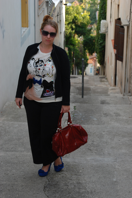 J’aime toujours autant mon joli t-shirt H&M issu de la collaboration avec Lanvin que j’avais trouvé sur le boncoin, ayant loupé la collection en magasin. J’avoue ne pas le porter souvent car j’ai peur de l’abimer. Étant déjà très chargé en fioritures,je l’ai associé à du noir, une valeur sûre pour le mettre en valeur.