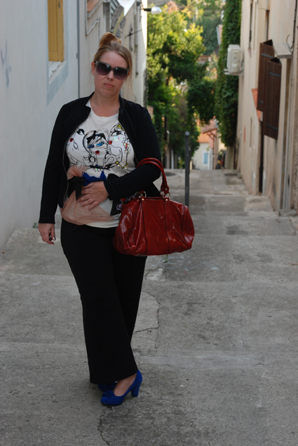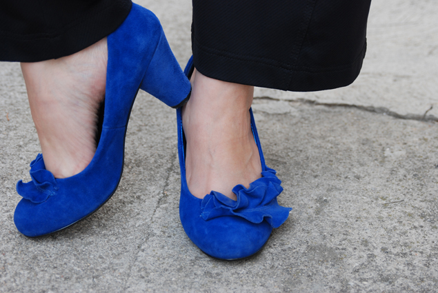 Mais bon, c’est moi tout de même, donc vous trouverez des touches de couleurs dans mes accessoires avec mes escarpins en daim bleu klein et mon sac du maroquinier italien Marant déniché l’automne dernier à la foire.