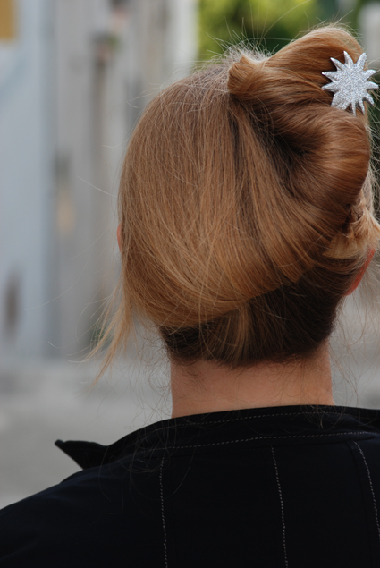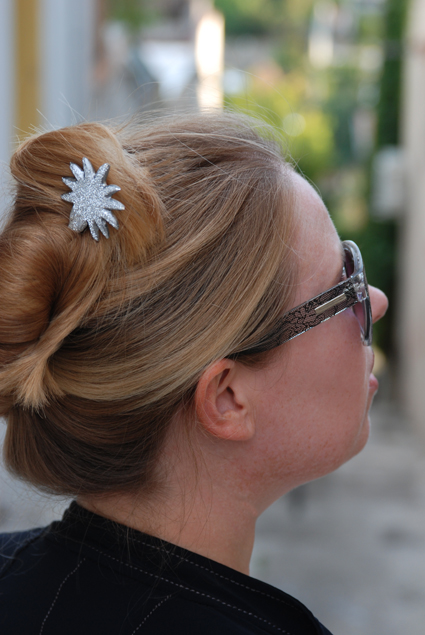 J’en profite pour vous montrer une coiffure toute simple réalisée avec l’épingle à cheveux du créateur bijoutier Shadi que j’ai découvert à la foire cette année. Il conçoit des bijoux en aluminium gravé, une matière hypoallergénique, légère et précieuse à l’aspect.