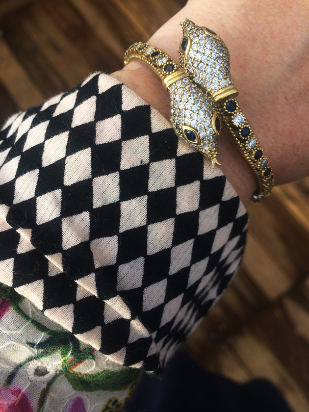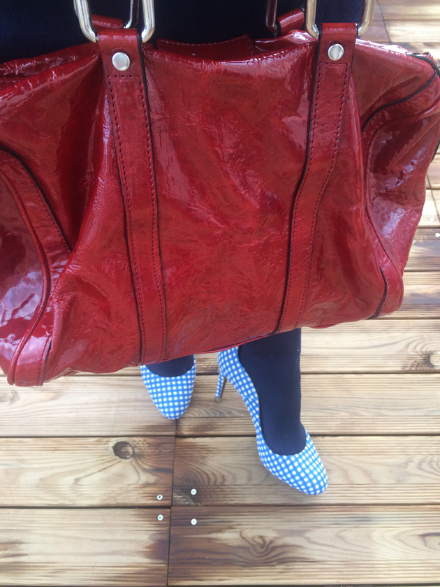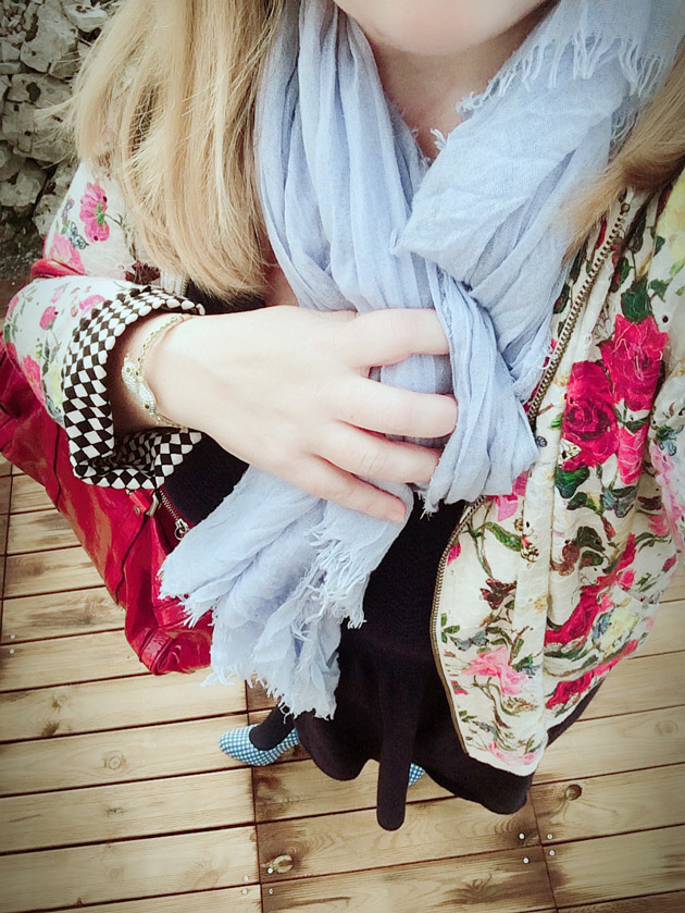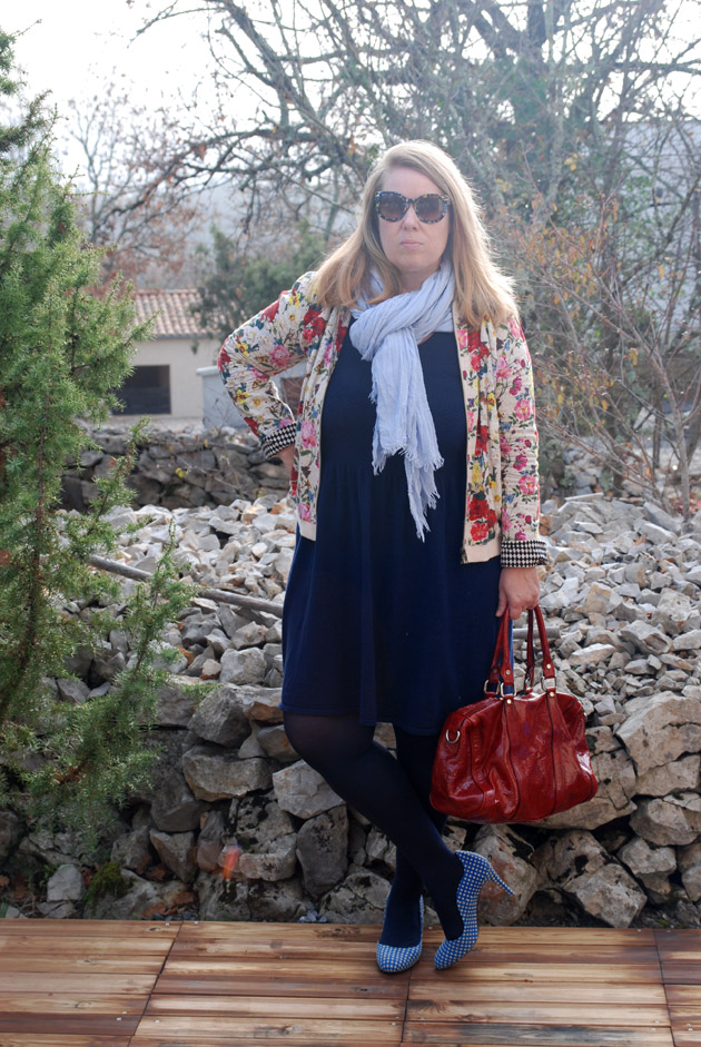 une petite robe basique, rehaussée d’une veste fleurie et d’escarpins en vichy vertigineux.