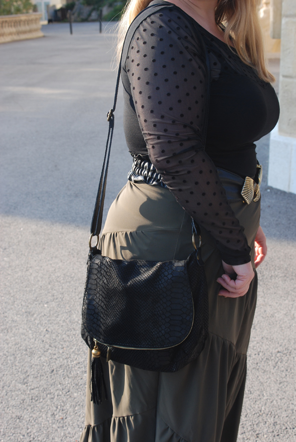 A la base, je voulais un sac ni trop grand ni trop petit, basique, noir, en bandoulière, avec un cuir épais et solide. Petit plus du modèle choisi, c’était son originalité avec son cuir gravé qui lui conférait tout son style, snif… A la place, j’ai eu la même forme mais un cuir imitation peau de serpent en aspect daim, donc très fragile et sensible au frottement sur les vêtements. Il me plait mais aura une durée de vie limitée et je n’aime pas le gaspillage, je garde la plupart de mes sacs 5 à 10 ans. Je vous en laisse juger par vous même.