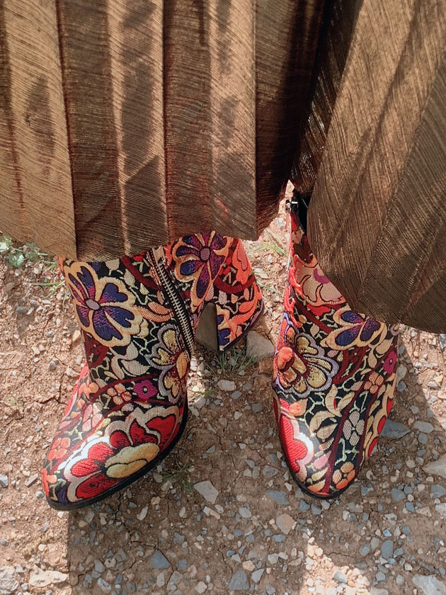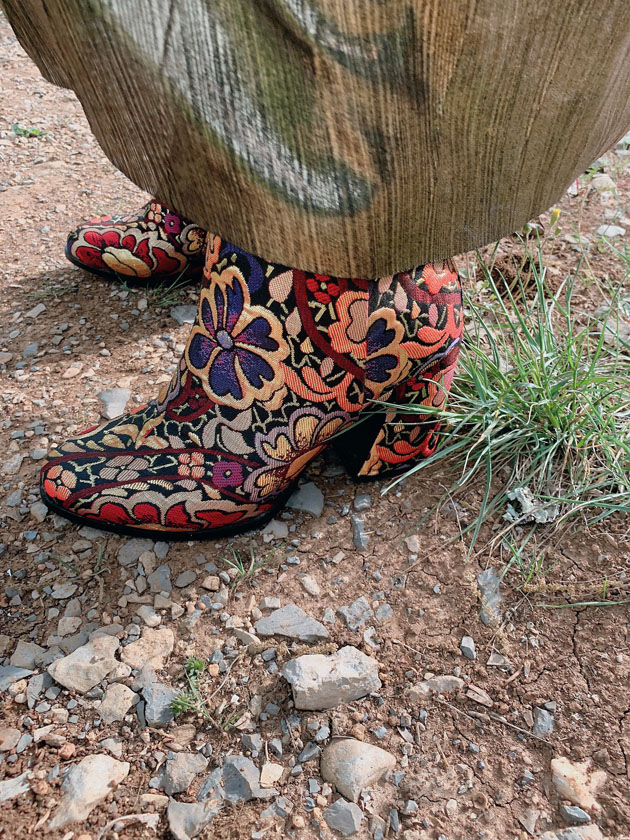 Aux pieds, mes boots brocardées Mellow Yellow, un