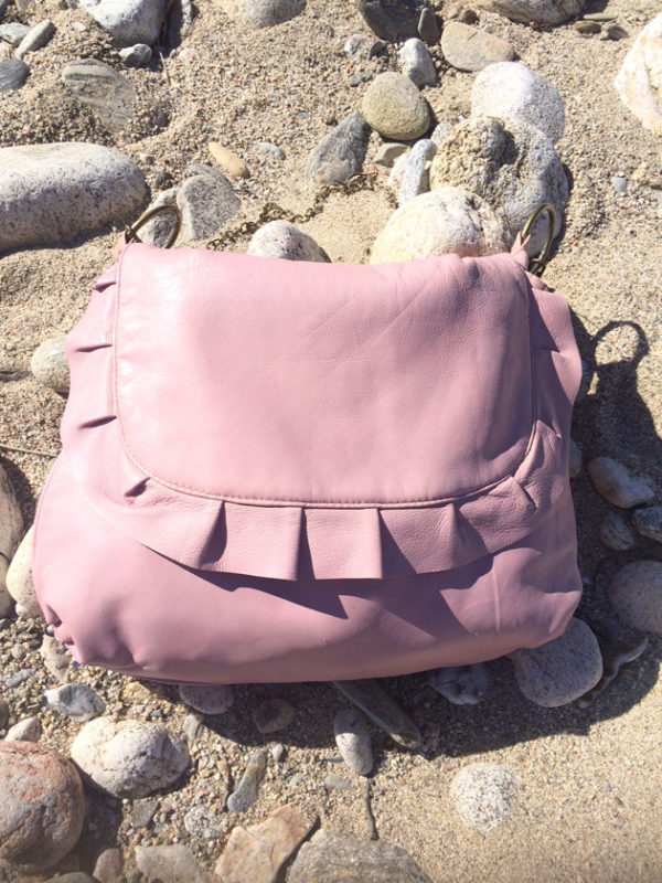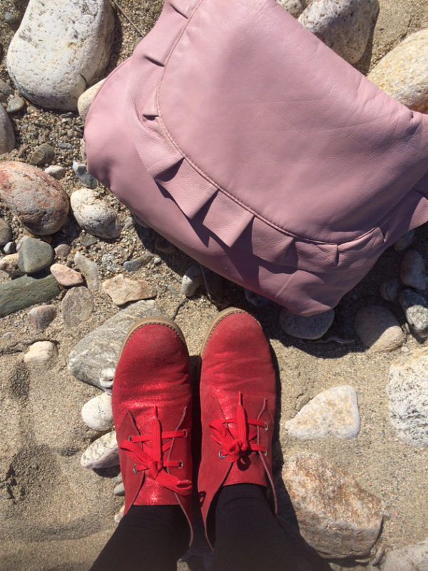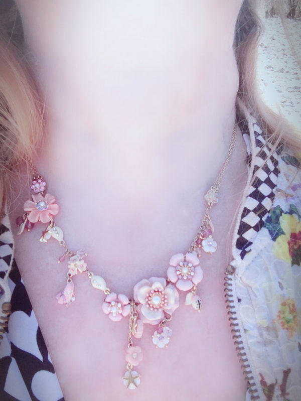 Côté accessoires : un petit collier à fleurs Les Néréïdes Paris, un sac en agneau rose Zoé la Fée et de vieilles chaussures Mellow Yellow rouges irisées.