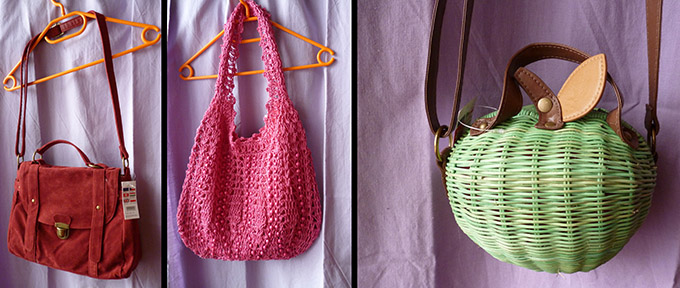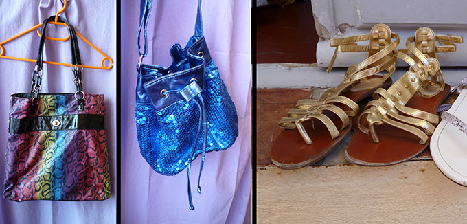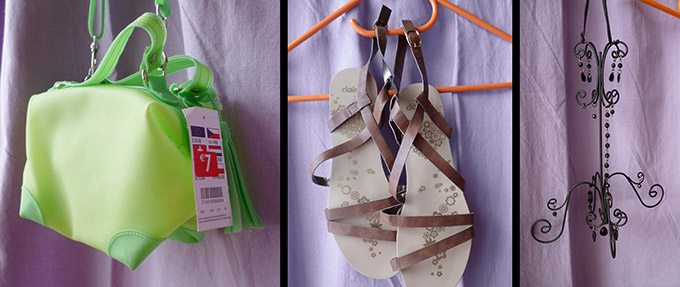 Accessoires ramenés lors de « super démarques »: sacs tendance bling et sandales avec passant pour orteil. A 1 €, pièce, je n’ai pas risqué grand chose. Au pire, une amie ou ma mère récupérait l’objet…