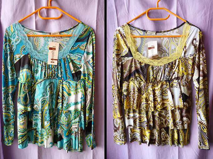 Ne m’arrêtant pas en si bon chemin, je suis allée chez Papi, boutique à prix mini où je ne m’attendais pas vraiment à voir les soldes, étant donné que la plupart des articles font 3 ou 6 €… Et bien si ! -50% sur les 3/4 du magasin ! J’ai donc opté pour une valeur sûre, ces 2 hauts à froufrous, infroissables, confortables et jolis.