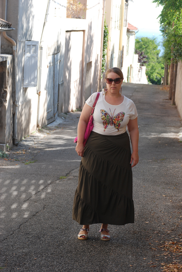 La jupe longue, on aime, ou on déteste, et je respecte tout à fait cet avis. On m’a toujours dit qu’on ne met pas de jupe longue quand on est petite. Et bien moi je trouve ça pratique pour aller travailler parce que quand tu passes une partie de ta journée sur une échelle, t’as pas trop envie de montrer tes fesses. Par contre, j’avoue qu’il vaut mieux mettre des talons pour ne pas tasser la silhouette. J’ai craqué sur cette forme de volants asymétriques qui lui confère son originalité, je suis plus réservée sur sa couleur « marron, gris, kaki » mais je me dis que ça peut se résoudre si besoin avec une petite teinture maison… Pour l’instant, j’hésite alors je vous la montre brute, vous me direz ce que vous en pensez…