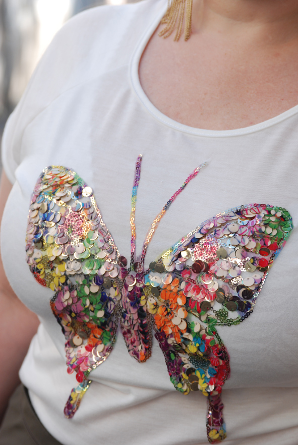 Ma seule nouveauté est un top en coton blanc avec un papillon en paillettes multicolores de chez Eurodif. Il m’a vraiment beaucoup plu, j’ai craqué.
