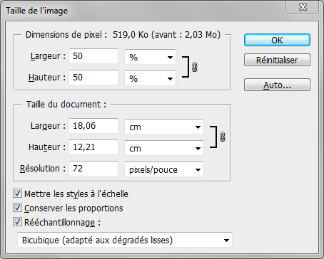 On choisit la dimension (en cm ou en pixel), on met une résolution à 72 DPI et on clique sur OK. Pour info, je suis sur WP avec un hébergeur payant. Mes images redimensionnées mesurent 15 cm x 22.5 cm pour 72 DPI afin qu’elles rentrent parfaitement dans le thème WP que j’ai choisi. Pour trouver votre dimension idéale, pas de magie, il faut faire des tests. Gardez en tête qu’il vaut mieux que votre image soit trop grande quitte à être réduite dans votre blog que inversement car sinon elle sera flou.