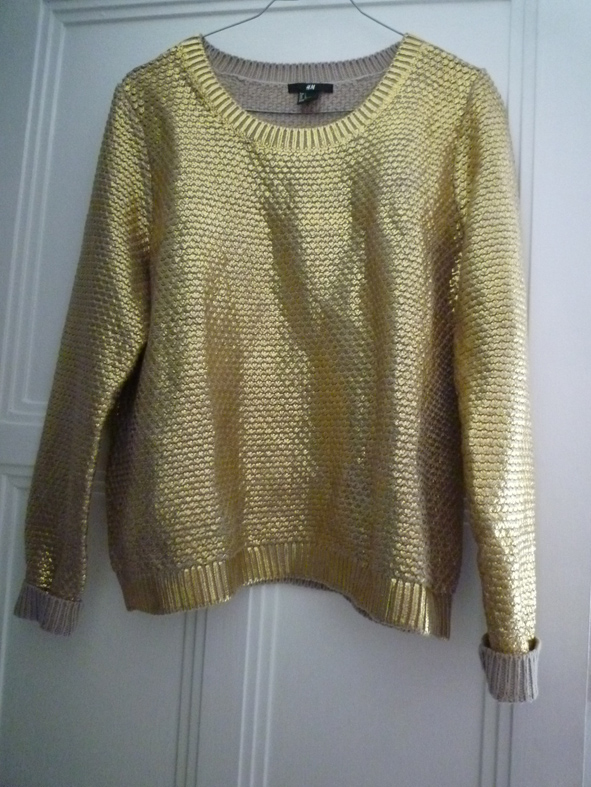Sur Vinted, je cherchais depuis longtemps le fameux pull H&M doré. J’ai mis la main dessus pour 7€. Comme j’avais des sous dans ma cagnotte, je ne l’ai pas payé.
