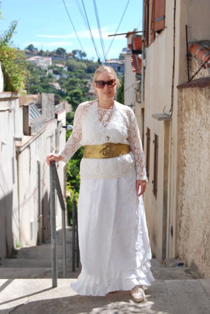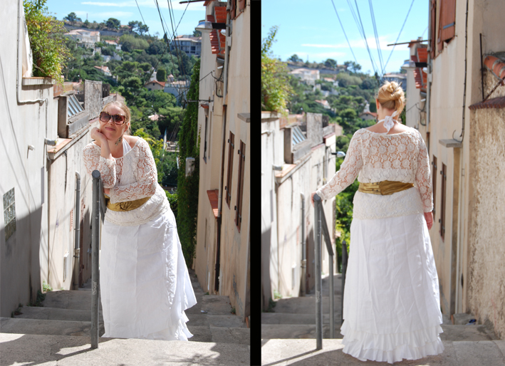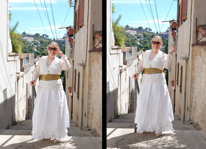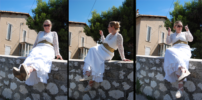Je voulais vous montrer une tenue d’été, une tenue blanche, cette couleur ambiguë qui est à la fois symbole de pureté, ou marque de deuil selon la religion et le pays… Je trouve que cette tenue symbolise bien mon état d’esprit actuel où comment faire le deuil d’une aventure à deux pour marquer un nouveau départ en solo…
