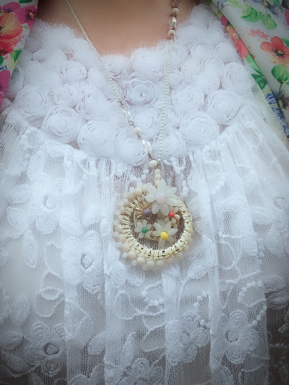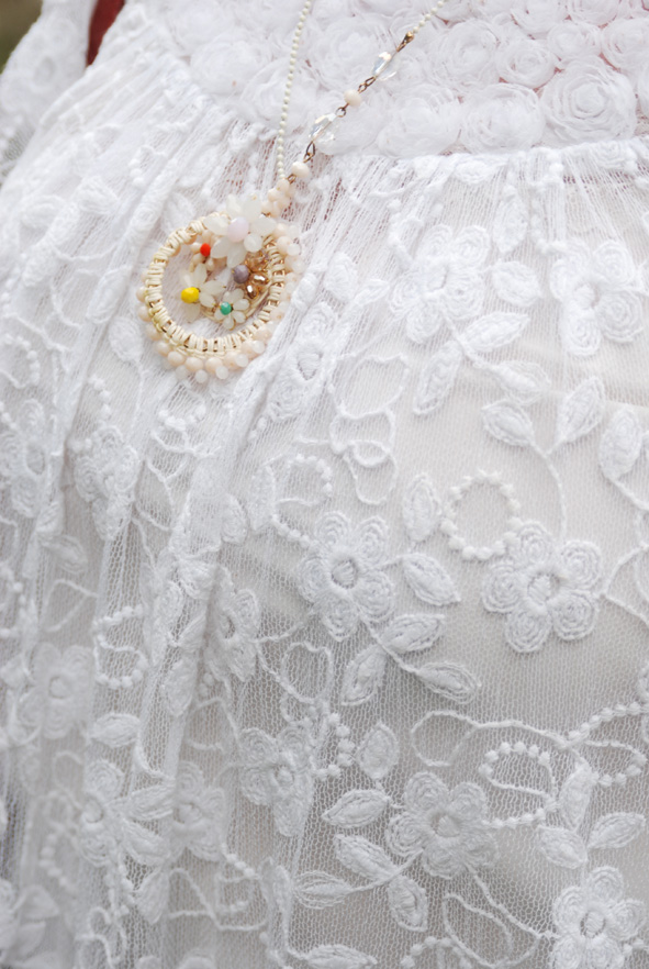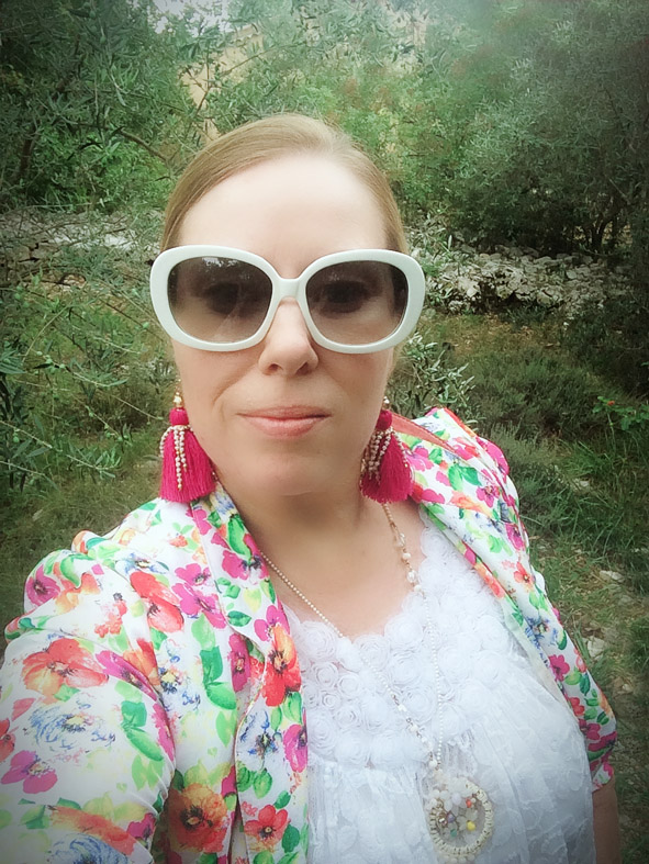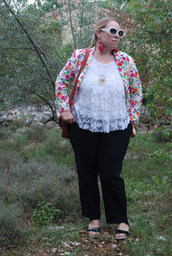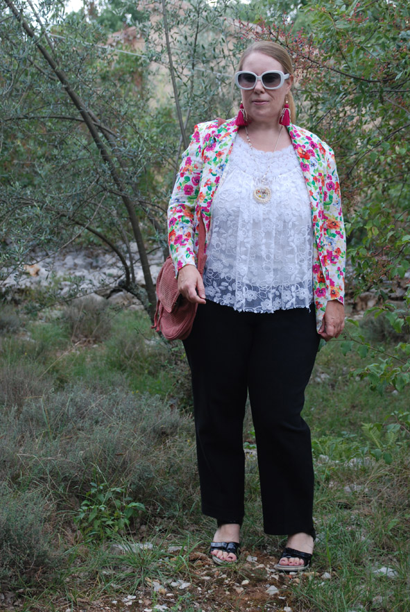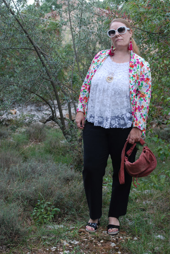 Cette petite veste fleurie est vintage. Je l’avais dénichée sur EBay il y a quelques années et elle était parfaite, puis j’ai eu l’idée saugrenue de la laver… Et elle n’a pas du tout aimé cette expérience, car elle a perdu au moins 2 tailles. Je ne pouvais plus l’enfiler, à tel point que pour pouvoir encore en profiter, j’ai été contrainte de découdre la doublure, et malgré tout elle demeure hyper serrée. Je suis donc contrainte de la porter lorsqu’il ne fait pas froid et sans manches dessous.