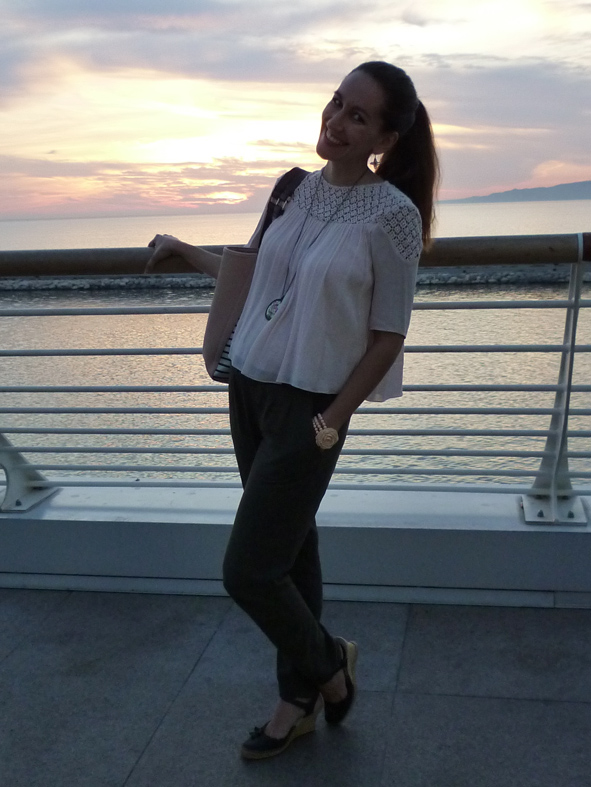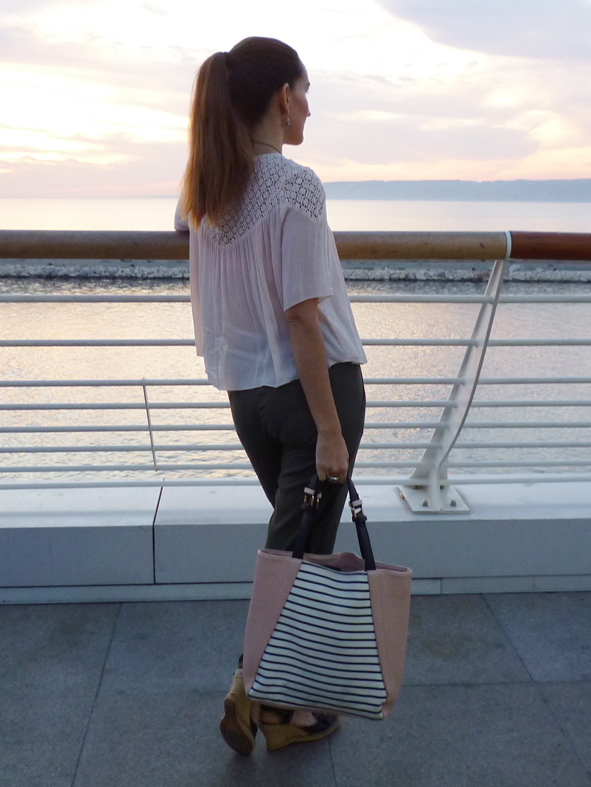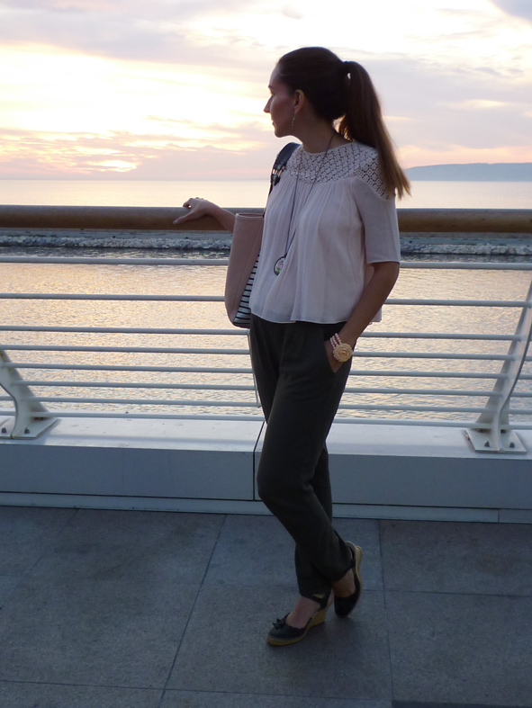 Justine a marié avec merveille le rose poudré et le kaki qui sont les tendances de l’automne avec un top en dentelle Zara et un pantalon Promod pour une tenue complète à moins de 30€!