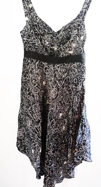 Col rond, petit manche et ruban pour marquer la taille. Longueur : 90cm, poitrine : 40cm, taille : 36cm, hanches : 43cm.