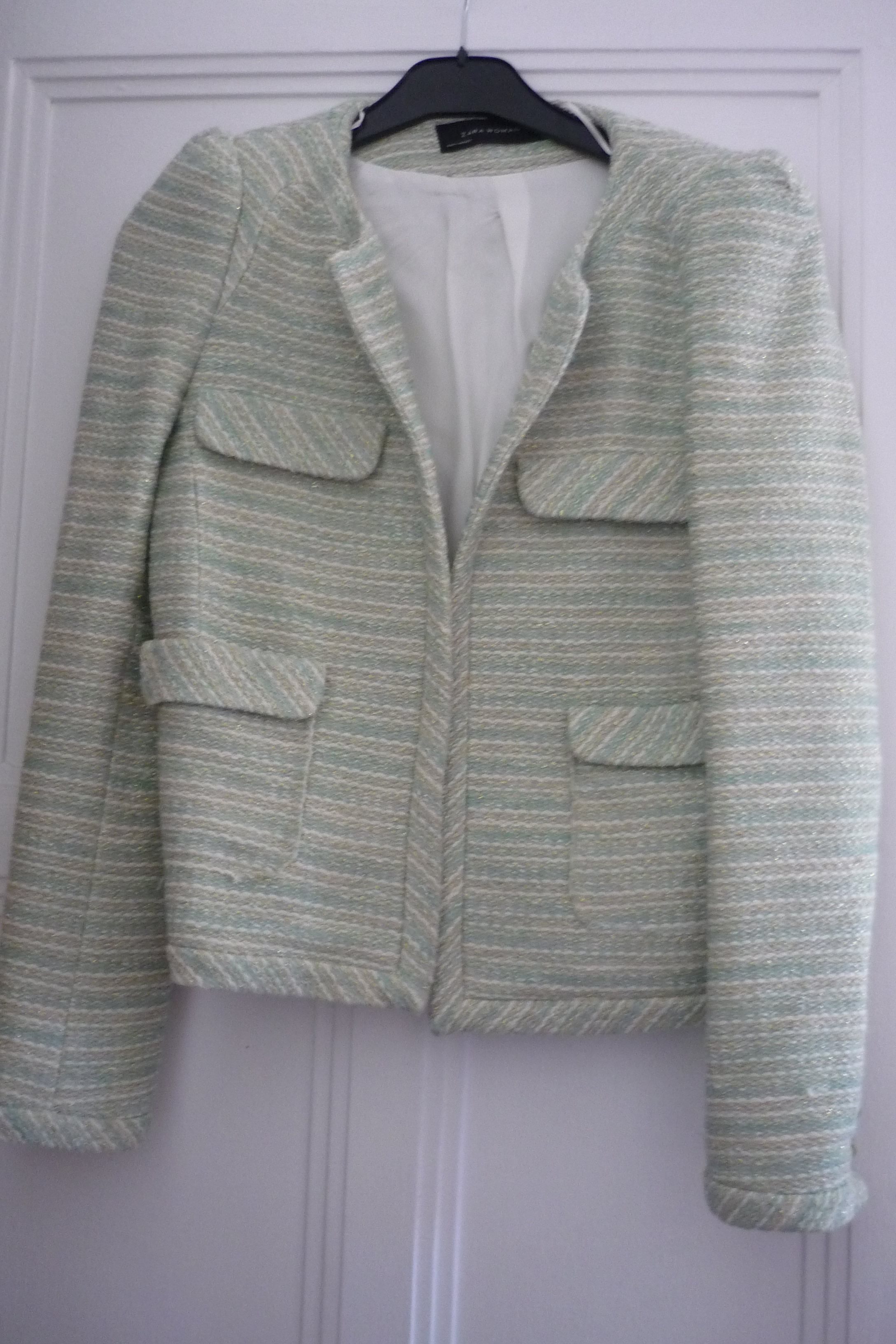 Veste tailleur chanelisant Zara vert pâle avec des filets or lurex. TL = 40 Se porte ouverte 2 fausses poches sur poitrine et 2 vraies poches en bas. Manches avec des boutons dorés (1 de rechange dans doublure). Peu portée. Passe en machine à 30 dans un filet sans soucis. Épaulettes pour structurer la carrure.